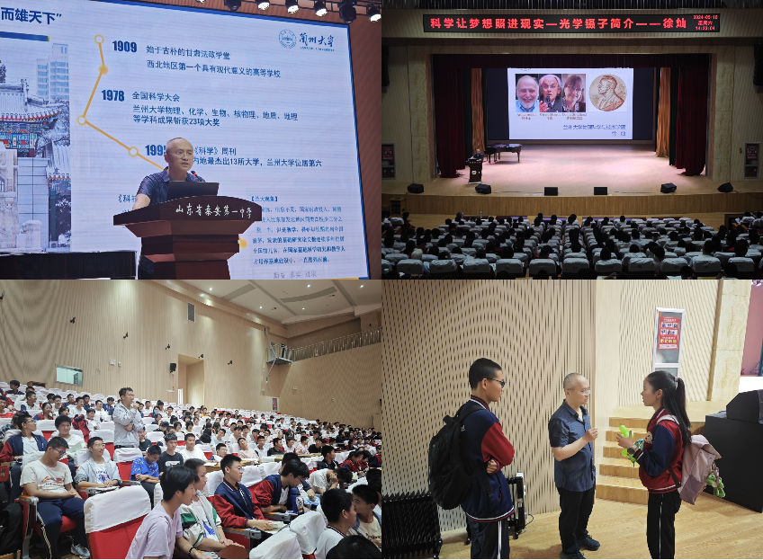 在泰安地区,5月18日下午徐灿和樊金雷老师走进泰安一中新校区开展了招生宣讲和科普讲座活动。面向500多名高二同学徐灿老师分别做了题为《青出于兰,大有可为》的招生宣讲和题为《科学让梦想照进现实——光学镊子简介》的科普报告,向同学们介绍了兰州大学的办学特色和优势同时,也给同学们科普了最前沿的物理诺奖知识,受到了同学们的热烈欢迎,部分同学会后还和两位老师进行就兰州大学一些具体情况进行了咨询和交流。