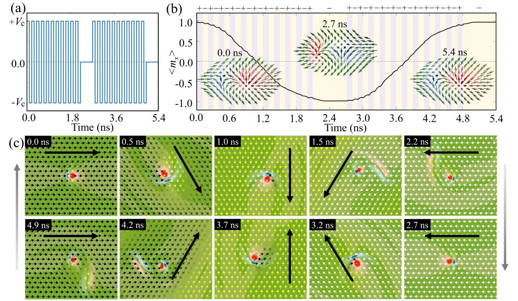 图2. (a)用于产生Bimeron力矩的交变脉冲电压;(b) Bimeron力矩驱动的平均面内磁化<mx>的正向切换(0-2.7 ns)和反向切换(2.7-5.4 ns);(c)对应于(b)中面内磁化切换的Bimeron动力学。长实箭头表示铁磁背景方向。