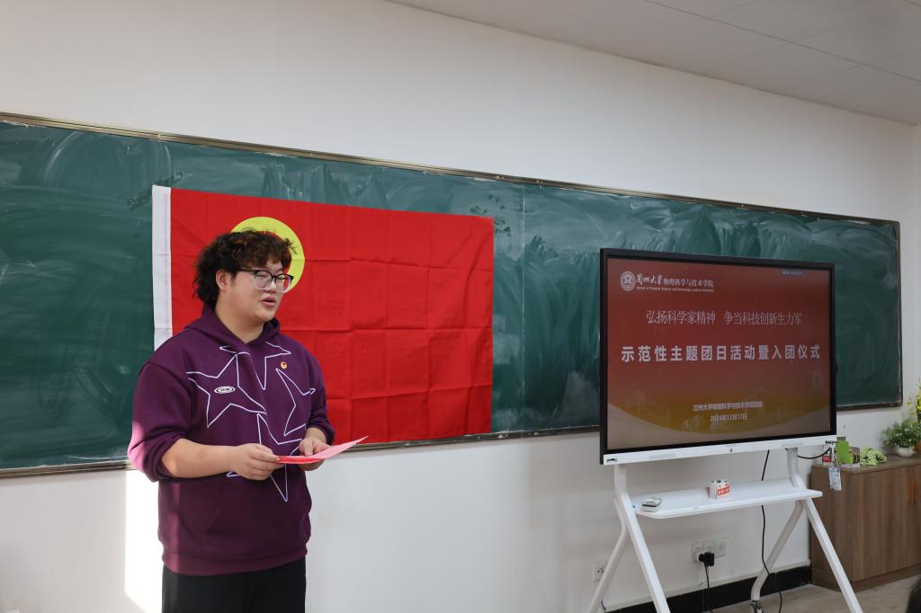 为进一步加强基层团组织建设,引导团员青年勇当强国建设民族复兴的先锋队、突击队,12月17日,物理学院在城关校区格致楼段一士学术讨论室举行“弘扬科学家精神 争当科技创新生力军”示范性主题团日暨入团仪式。研究生凝聚态五班团支部成员,学院2024年下半年新发展团员代表,学院各团总支、团支部书记参加活动。学院任继荣副教授、校团委创新发展与实践中心主任田贯辉、学院团委书记张晓晓、学院团委副书记樊金雷出席活动。学院团委副书记(学生兼职)郝铭淳主持活动。