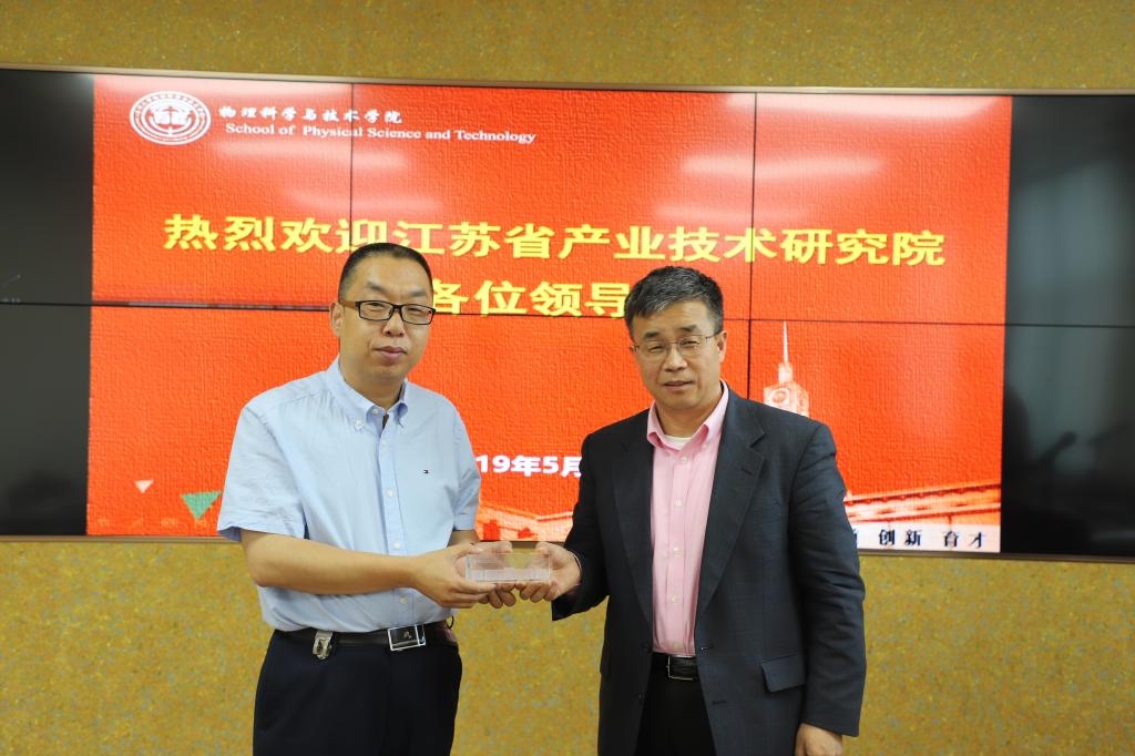 2019年5月30日,江苏省产业技术研究院党委书记胡义东、院长助理郜军、我院77级物理系半导体专业校友、江苏省产业技术研究院智能液晶技术研究所执行所长、江苏集萃智能液晶科技有限公司董事长薛九枝等一行6人来我院访问交流,并在格致楼3016会议室举行座谈会。吴国军书记、罗洪刚院长、刘玉孝副院长、化学院梁永齐副教授、生科院刘永俊教授、何永兴副教授以及微电子教研室部分教师以及物理系77级本科生王开富副教授、李炳彦老师参加了座谈会。座谈会由物理学院院长罗洪刚主持。