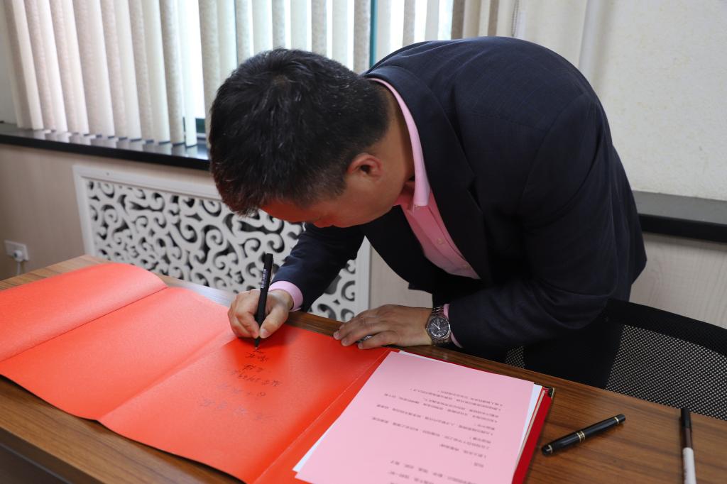 最后,吴国军书记为校友薛九枝以及郜军赠送了刻有格致楼建筑外型的纪念品,薛九枝老师也在留言簿上为兰州大学百十校庆写下了自己的祝福,双方在格致楼前拍照留念。