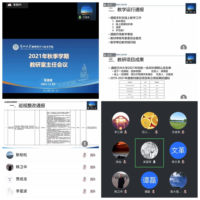 当前,甘肃省疫情防控正处在最吃紧的关键阶段,为贯彻落实学校疫情防控期间“停课不停教、停课不停学”工作要求,进一步做好疫情防控期间的教学工作安排,确保教学秩序和教学质量同步有序进行,各项教学工作平稳、顺利、有序开展,11月2日,物理学院通过腾讯会议平台召开2021年秋季学期教研室主任/副主任线上工作会议。党委书记吴国军,院长罗洪刚,副处级组织员李鹏君,副院长李星波,各教研室主任、副主任及研究生辅导员王昀等20余人参加会议。会议由教学副院长王建波主持。