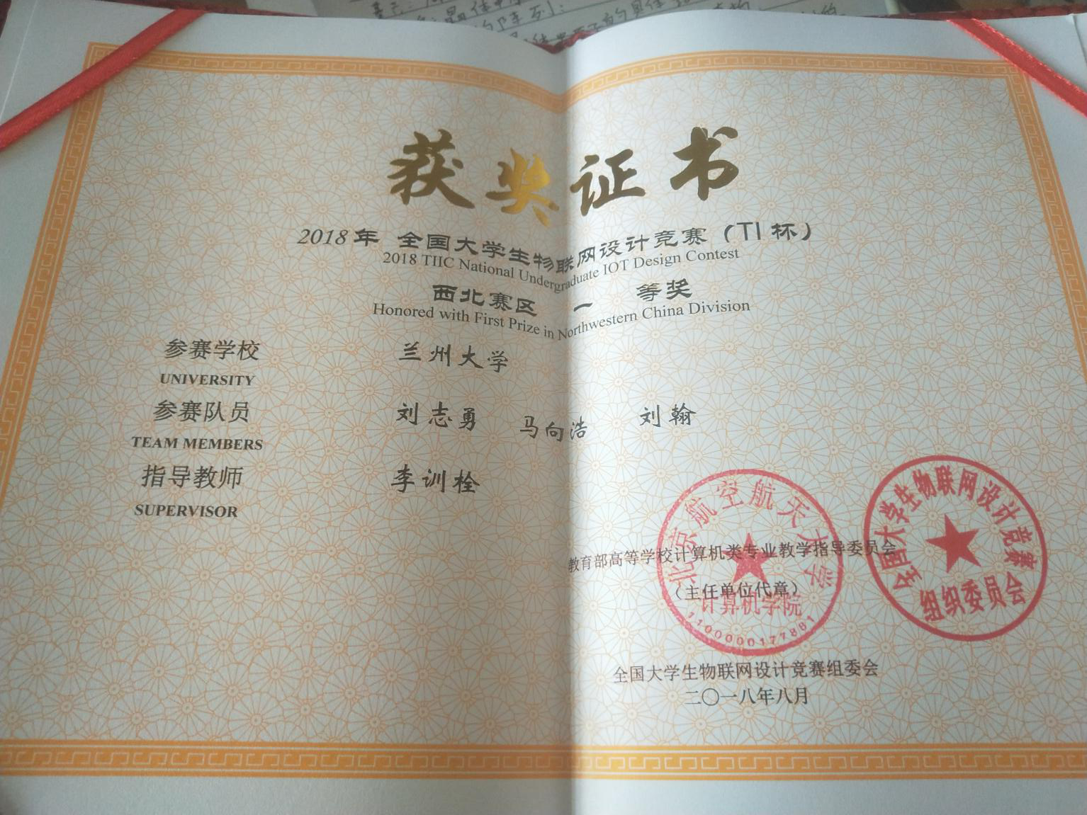 8月25日,2018年全国大学生物联网设计竞赛(TI杯)西北分赛区决赛暨颁奖典礼在兰州交通大学圆满落幕。刘志勇、马向浩和刘翰同学组成的foliage队获得了本次大赛一等奖,指导老师为兰州大学开云online(中国)李训栓老师。