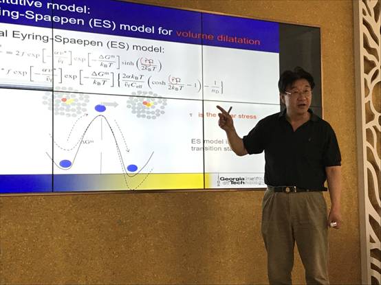 30日上午,李默教授在格致楼3016做了题为“纳米玻璃:利用非均匀空间构型硬化韧化金属玻璃的新方法”的报告,并就纳米玻璃问题及计算材料学等问题与我院师生进行了交流。提高金属玻璃宏观塑性和韧性的方法之一,是引入各种非均匀结构,这些非均匀性有望改变局部剪切行为。然而,这些尝试产生的效果有限,有好有坏。在报告中,对非均匀结构及其对力学性能的影响进行了系统研究。首先定义了两种“非均匀性”:一种是统计非均匀性,如自由体积统计分布;另一种是非均匀性的空间分布或构型。他们发现,力学性能即强度和塑性,同时受到这两个统计分布随长度尺度变化的影响。例如,对于空间均匀分布的非均匀结构,当统计分布不均匀时,可使金属玻璃韧化甚至“硬化”,而不是相反。这导致了“非均均匀性空间构型”概念的形成和对能够提高强度和韧性的最佳构型的探索。他们努力设计了不同的“构型”,并检验了它们影响力学性能的有效性。纳米玻璃是利用纳米尺度结构来改变力学性能的新思路。他们发现,纳米玻璃的工作机制与非均匀性的“空间构型”紧密相关。如果适当长度尺度的非均匀结构的合理组织并同步运行的话,该构型可能具有优异的力学性质。