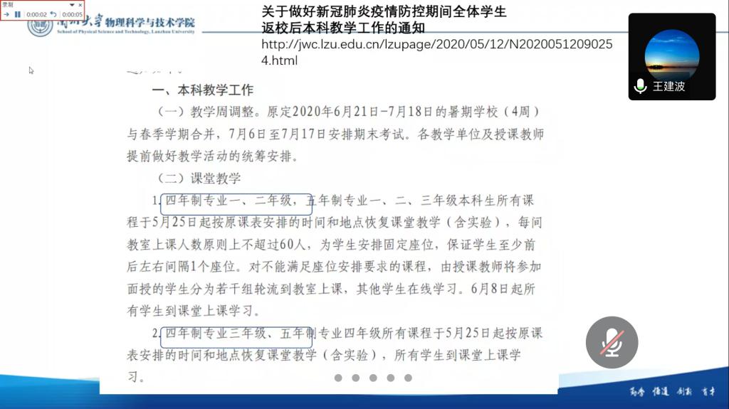 5月18日下午,物理学院借助腾讯会议召开了2020年春季学期一、二年级学生返校工作布置会,大一、大二授课教师参加会议。会议由教学副院长王建波主持。