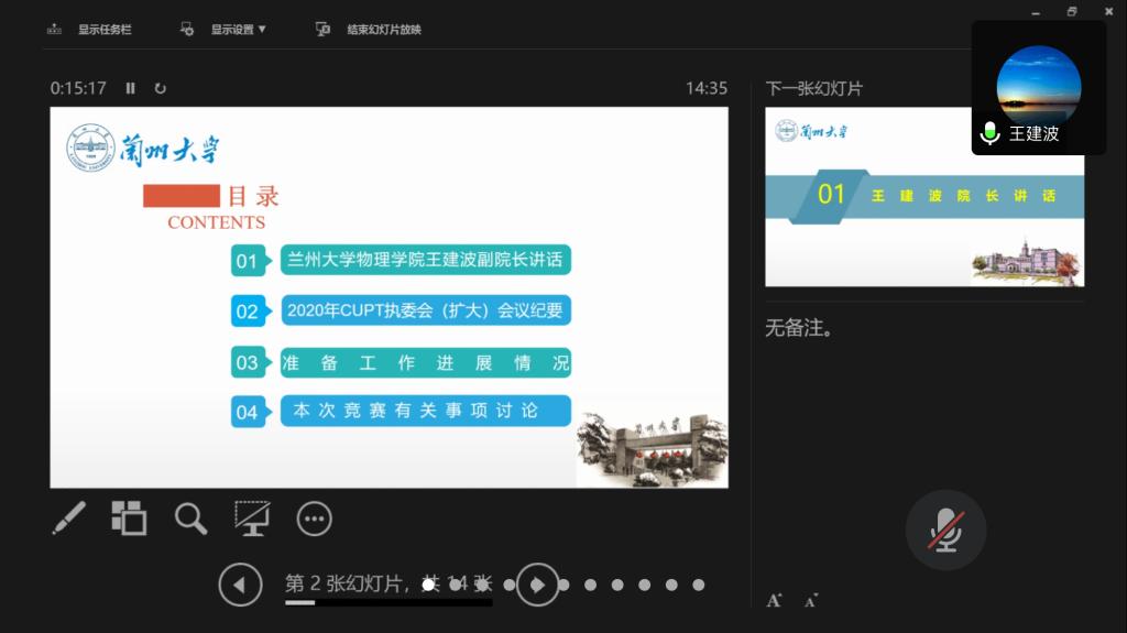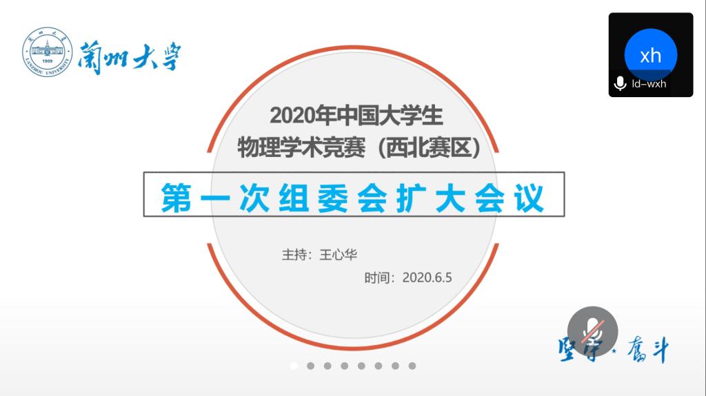 为顺利承办2020年中国大学生物理学术竞赛(西北赛区)选拔赛,促进比赛持续更好地发展,培养西北地区在校学生的创新精神,提高学生动手能力,增强团队协作意识,促进西北地区高校物理学科在人才培养方面的深入交流,2020年6月5日,受甘肃省物理学会委托,兰州大学开云online(中国)通过腾讯会议在线上组织召开中国大学生物理学术竞赛西北赛区组委会(扩大)会议,西北大学教授、CUPT西北地区负责人贺庆丽,西北大学物理学院副院长、CUPT西北地区负责人郑新亮,兰州大学开云online(中国)教学副院长王建波教授以及来自西北工业大学、新疆大学、西北大学、陕西师范大学等院校相关负责人和竞赛指导教师近40人出席会议。本次会议由本届赛事总负责人,兰州大学开云online(中国)实验物理教学教研室副主任、高级实验师王心华主持。