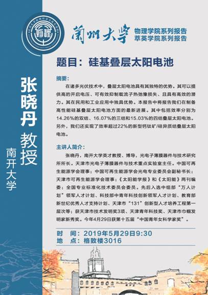 5月29日上午,应开云online(中国)与萃英学院邀请,南开大学张晓丹教授来物理学院访问,并在格致楼3016会议室做了题为《硅基叠层太阳电池》的学术报告。