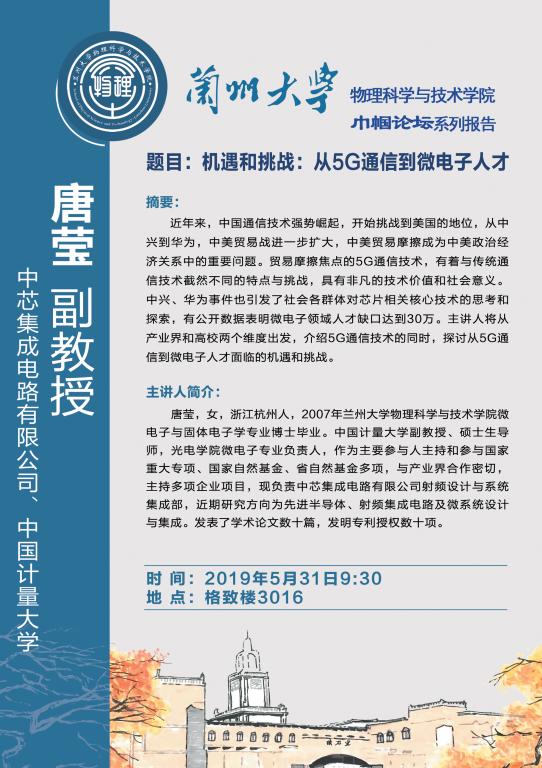 5月31日上午,应开云online(中国)和萃英学院邀请,中芯集成电路有限公司、中国计量大学唐莹副教授来物理学院访问,并在格致楼3016会议室做了题为《机遇和挑战:从5G通信到微电子人才》的学术报告。