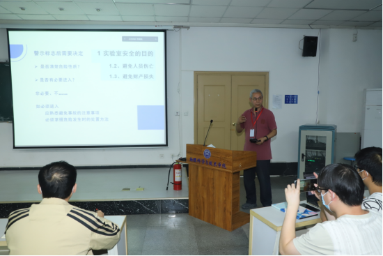 安全健康教育中心教员龙杨军、安全管理工作组组长周保范、组员唐丽云分别就“兰州大学消防安全状况和防范措施”、“物理学院实验室安全总体状况和防范措施”、“实验室保密安全”等进行了讲解。