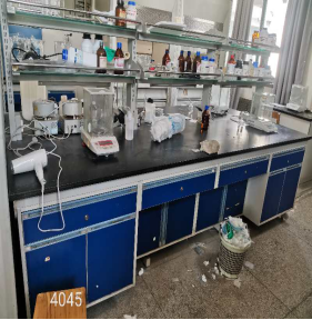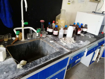 化学实验室水池柜、桌面等处卫生差、物品杂乱。