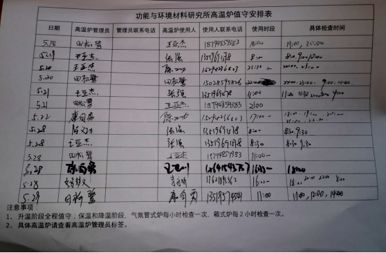 高温实验安全值守要求:使用电阻炉、烘箱等加热设备时要有人值守(或经安全论证制定值守方案,并严格按方案规定的时间间隔进行值守),或有实时监控设施;使用中的电阻炉、烘箱要标识使用人姓名和联系电话;使用完毕,清理物品、切断电源,确认其冷却至安全温度后方能离开。格致楼3045实验室(第一责任人:王育华)制作的《高温炉值守安排表》比较规范,相关实验室可以借鉴。