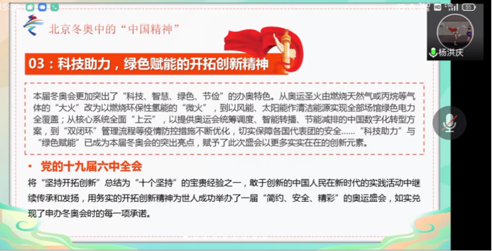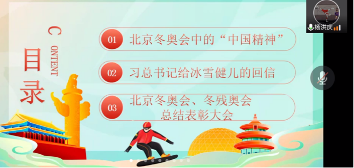 杨洪庆同学从北京冬奥会中的“中国精神”、习总书记给冰雪健儿的回信、北京冬奥会、冬残奥会表彰大会等几个方面展开讲述。最后以北京冬奥会口号“一起向未来”点明主题,激励同学们要紧跟时代步伐,做时代的开拓者。