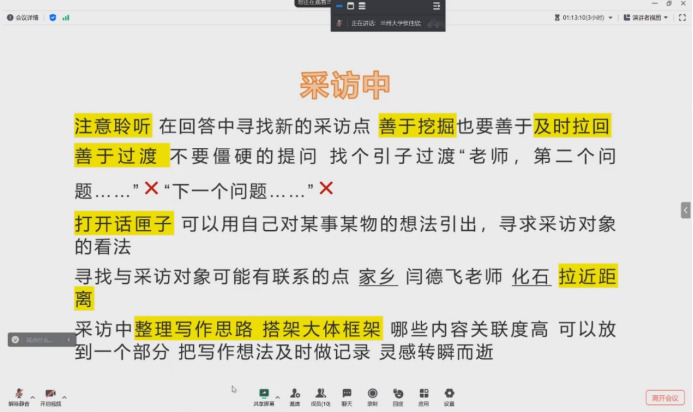 在人物采访方面,张佳欣同学不仅从专业的角度详细讲解了如何完成一个完整的采访过程,还结合自己丰富的工作经历分享了一些采访中的技巧。