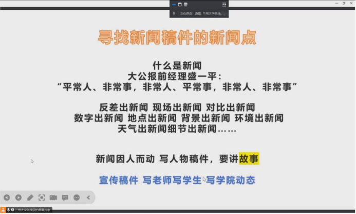 最后,章洁同学向我们普及了有关各类新闻写作的基本知识以及各种实用的写作手法与技巧。