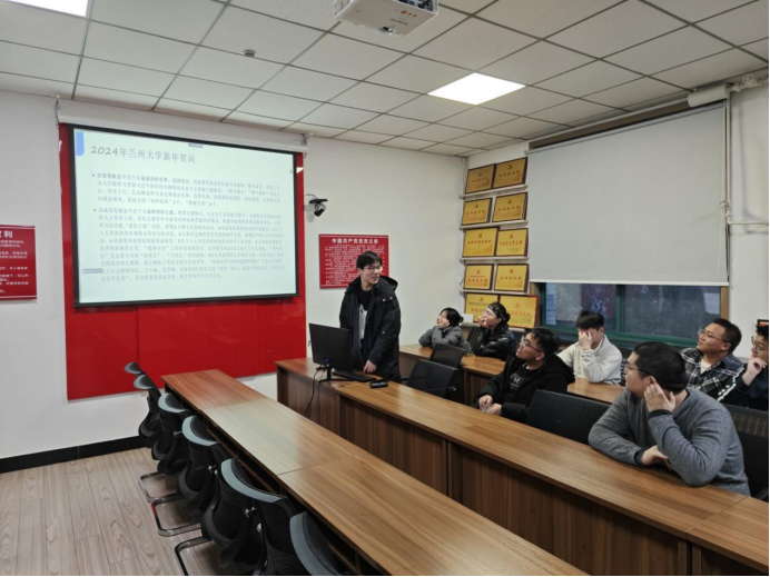 会议伊始,何洋以2024年兰州大学新年贺词为题与大家一同学习交流。新年贺词从思想引领、高质量发展、创新引领、合作共赢和团结奋斗五方面回顾了兰大取得的成就,并就凝心铸魂聚力、深化创新改革、厚植育人沃土、强化学科引领、塑造创新优势、构筑人才高地提出了工作目标和展望。