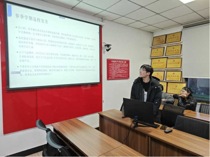 随后,针对寒假离校的逐项事宜,包括宿舍断电、归家途中天气以及寒假居家的安全问题等多方面内容,何洋与参会同学进行了讨论,并对返途购票可能出现的“退改签”等诈骗行为进行宣传引导。主题教育的最后,全体成员共同展望新的学期并对新学期返校的各种状况进行交流。