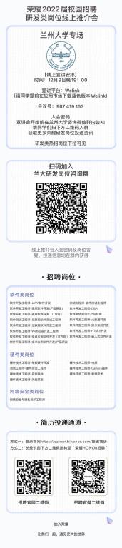 荣耀Honor校招研发类岗位空中宣讲会兰大专场